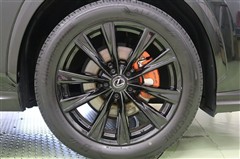 レクサスロゴが特別感のあるオレンジブレーキキャリパーが見えるデザインのスーパーグロスブラックメタル塗装で精悍な専用純正アルミホイールを装着しています。足元からラグジュアリー感が漂います。