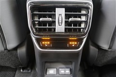 後席に向けたエアコン吹出し口です。この吹出し口が有ると、リヤエアコンがなくても後席の快適性はぐんとアップします。シートヒーターのスイッチや、足元には100V電源とUSBポートも装備されています。