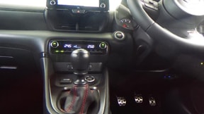 必要なものだけを残し、それ以外を大胆に削ぎ落とした視認性が良くて開放感のある運転席廻りです。ステアリングやプッシュスタートボタンのGRロゴが特別感を漂わせています。