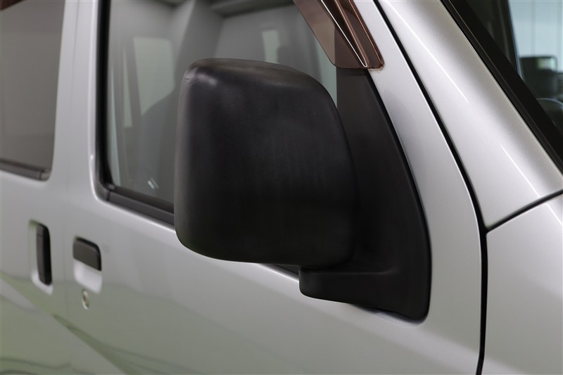 ウインドウフレームに溶け込むようにブラックアウトされたサイドミラーです。格納は運転席側も助手席側も手動です。