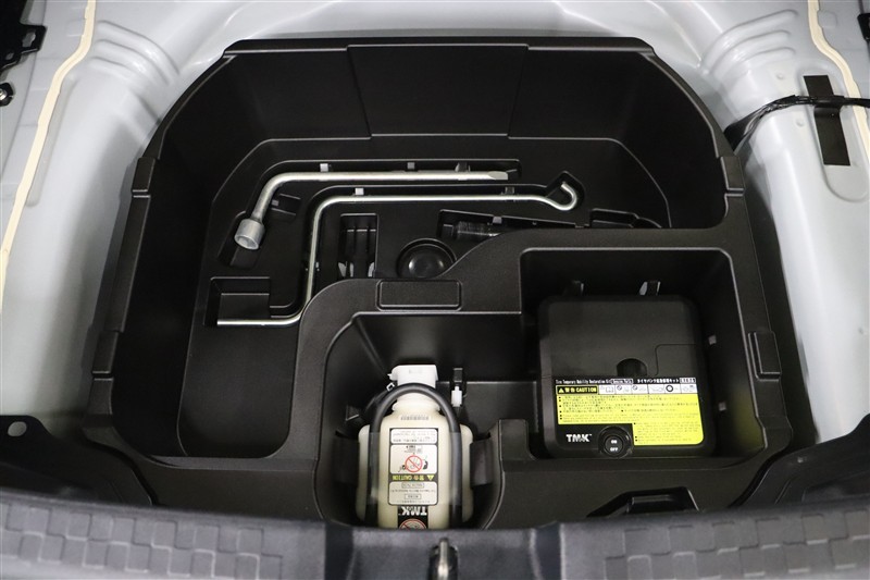 ラゲージスペースには床下収納を備えています。洗車用品などを入れておけて便利ですよ。スペース内にパンク修理キットを装備しています。最近は未使用のまま廃棄となるスペアタイヤが多いので、エコですね。