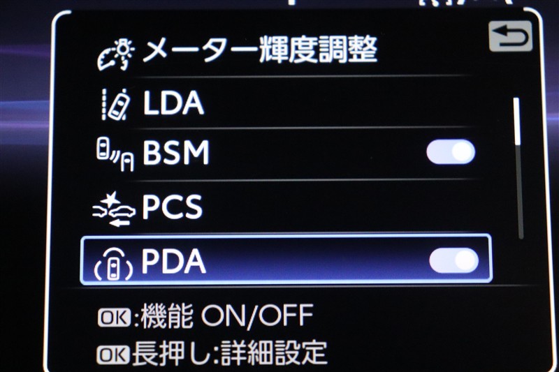 BSM搭載。並走車両が死角に入るとインジケーターが点灯。さらにウィンカーを出すと点滅します。BSMのシステムを活用し、バック出庫の際に左右から接近する車両を検知警告するRCTAも搭載しています。
