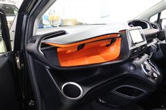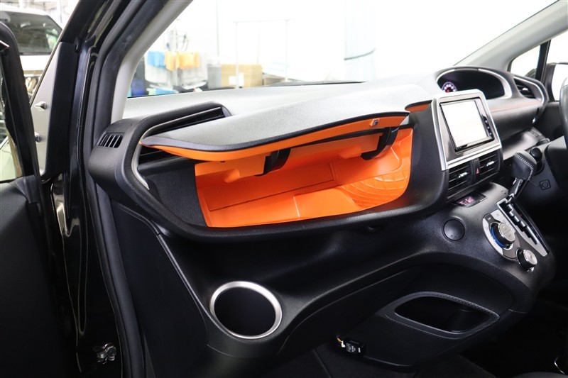 クリアな視界が広がるスッキリとした運転席廻りです。黒が基調でアクセントカラーのオレンジが映えます。助手席アッパーボックスの中は一面オレンジなので、なかなか衝撃です。