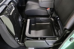 こんなところにも収納が!! 助手席の座面を上げると収納スペースが現れます。防水なので、濡れた靴や荷物も気にせず入れておけます。取っ手付きなので、外してそのまま持ち歩けます。