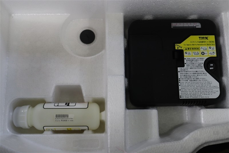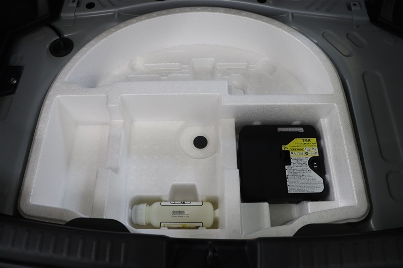 パンク修理キットを装備しています。最近は未使用のままで廃棄となるスペアタイヤが多いので、エコの観点からパンク修理キット付が増えています。軽量化によって燃費の向上にも一役かっているそうです。