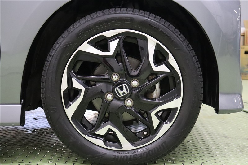 ブラック塗装に切削加工を施したアグレッシブなデザインの純正15インチアルミホイールを装着しています。足元を引き締めてくれ、しっかりした走りも楽しめますよ。