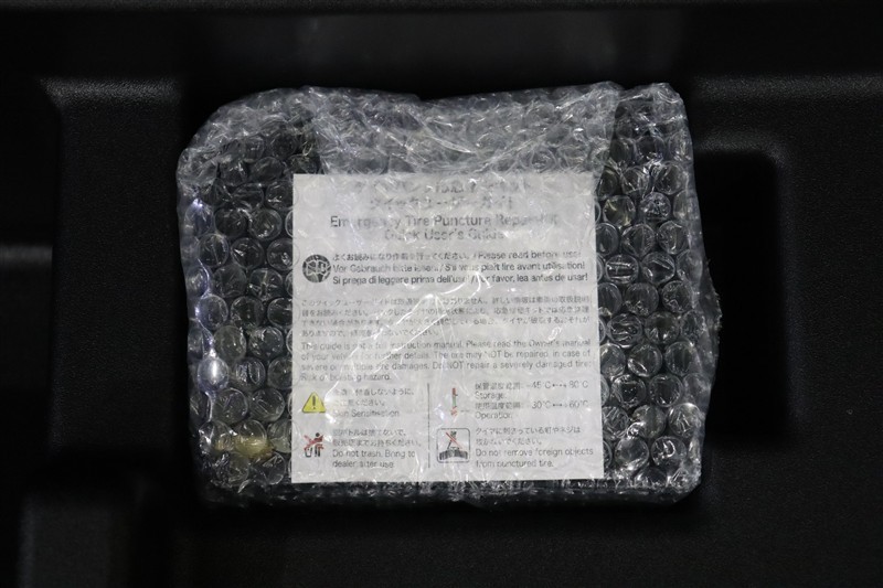 パンク修理キットを装備しています。最近は未使用のままで廃棄となるスペアタイヤが多いので、エコの観点からパンク修理キット付が増えています。軽量化によって燃費の向上にも一役かっているそうです。
