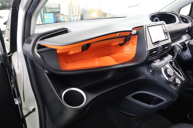 ビビッドなオレンジのアッパーボックスです。インパクトがあるだけではなく、段差やカーブがあることで収納しやすく、取り出しやすいですよ。センターコンソールサイドポケットやオープントレイも使える収納です。