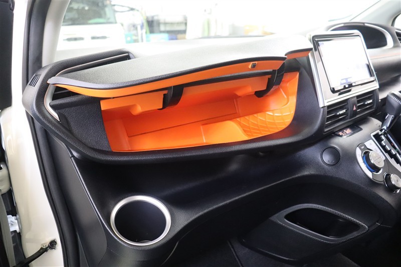 必要なものがシンプルに配置され、広々と視界が広がる運転席まわりです。アクセントカラーのオレンジがお洒落ですね。助手席アッパーボックスを開ければ一面オレンジ色です!なかなかインパクトがありますよ。