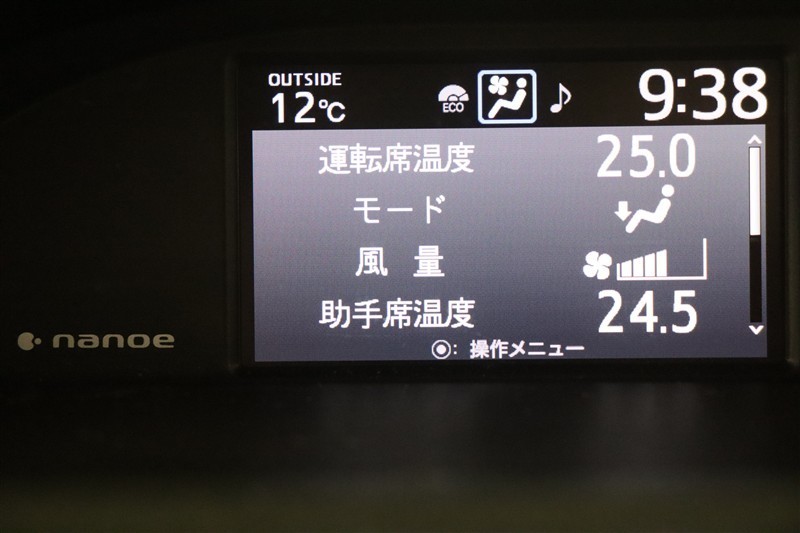 デザイン性の高いエアコンパネルはプッシュ式。左右独立の温度設定が出来るので席による温度差も解消できて快適です。ナノイー搭載ですので、肌や髪にやさしいナノイーが室内を爽やかな空気環境にしてくれます。