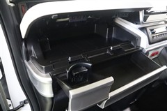洒落なデザインのリッド付きアッパーボックスは幅広で長財布やスマホも余裕で収納出来ます。アッパーボックス下の引き出しにはBOXティッシュも収納出来ます。ドリンクホルダーも引出し式で邪魔になりません。