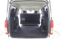 これがハイエースの魅力の大容量のラゲージスペースです。ロードバイクなら4台、サーブボードもまっすぐ積めるゆとり充分のロングスペースです。