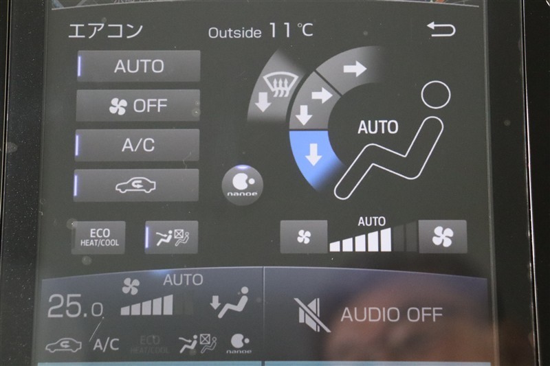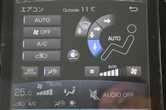 ナビ画面のエアコン情報表示エリアにタッチするとエアコン操作画面が表示されます。温度設定などよく使うボタンはナビ画面横ボタンでプッシュ操作できます。