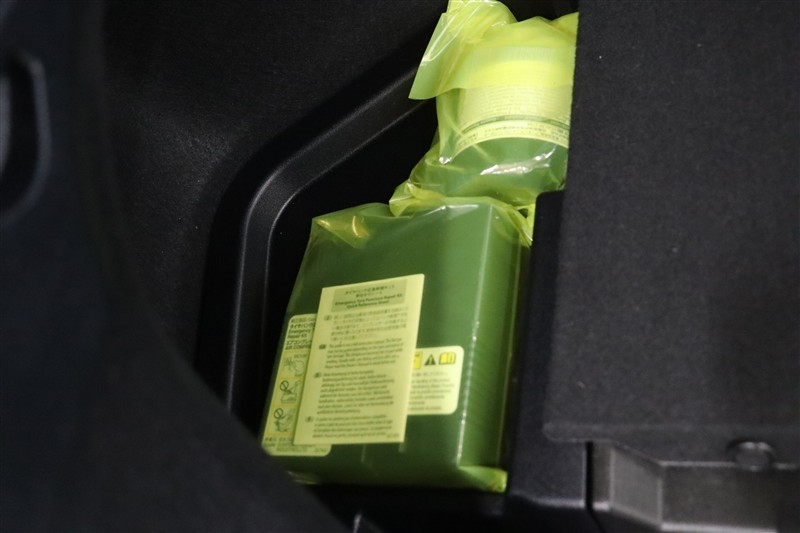 パンク修理キットを装備しています。最近は未使用のままで廃棄となるスペアタイヤが多いので、エコの観点からパンク修理キット付が増えています。軽量化によって燃費の向上にも一役かっているそうです。