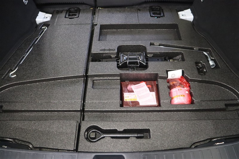 ラゲージスペースには床下収納を備えています。洗車用品などを入れておけて便利ですよ。スペース内にパンク修理キットを装備しています。最近は未使用のまま廃棄となるスペアタイヤが多いので、エコですね。