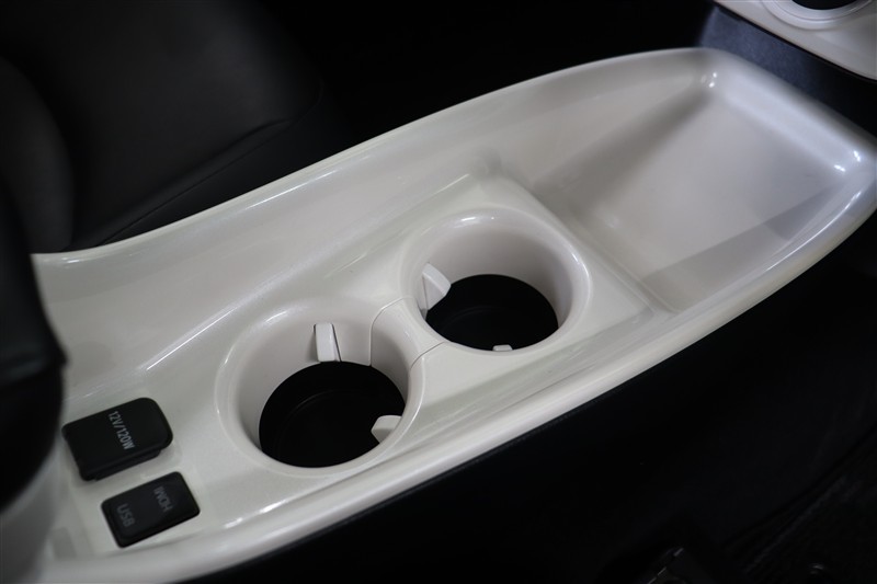 陶器のような滑らかな白が際立つセンターコンソールにはドリンクホルダーを備えています。トレイとドリンクホルダーがフラットなので、バッグ置き場として使えるので便利ですよ。