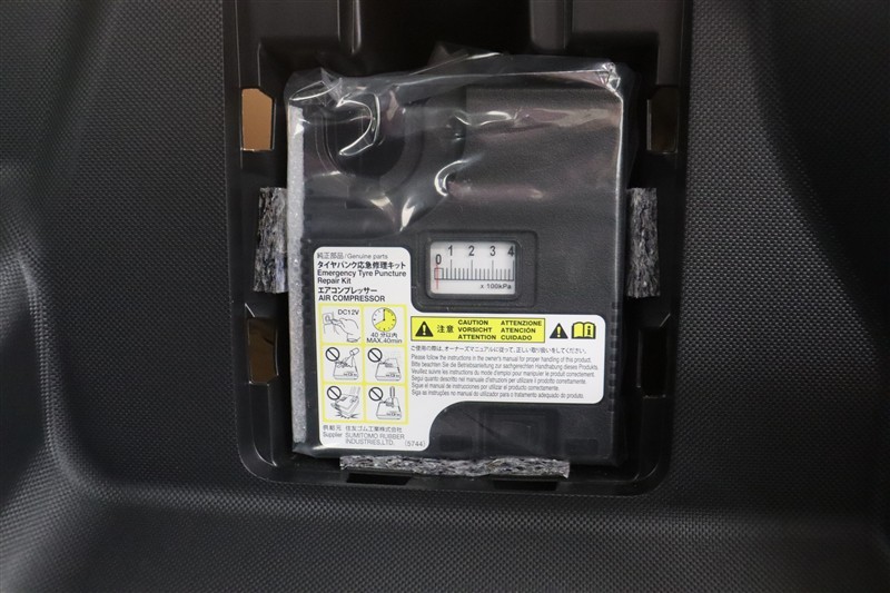 パンク修理キットを装備しています。最近は未使用のままで廃棄となるスペアタイヤが多いので、エコの観点からパンク修理キット付が増えています。軽量化によって燃費の向上にも一役かっているそうです。