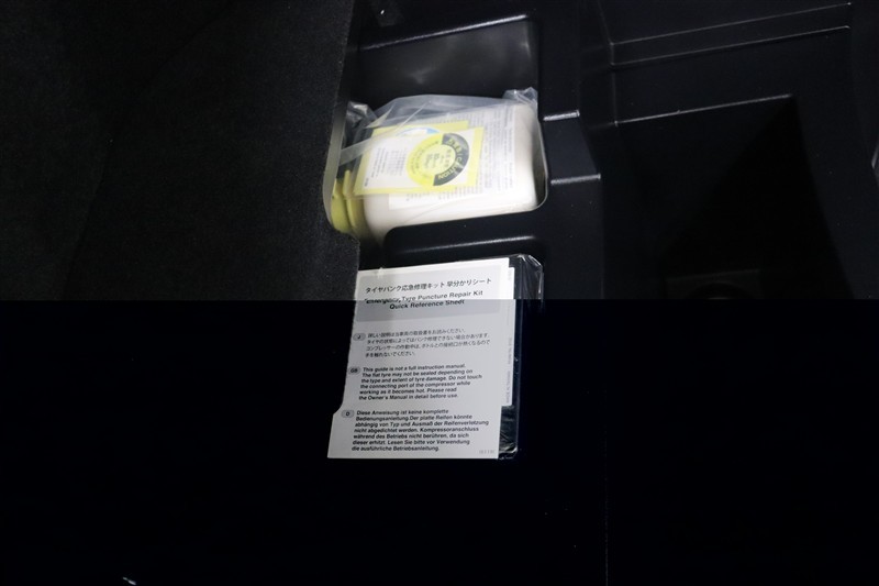 パンク修理キット付きです。最近は未使用のままで廃棄となるスペアタイヤが多いので、エコの観点からパンク修理キット付きが増えています。軽量化によって燃費の向上にも一役かっているそうです。