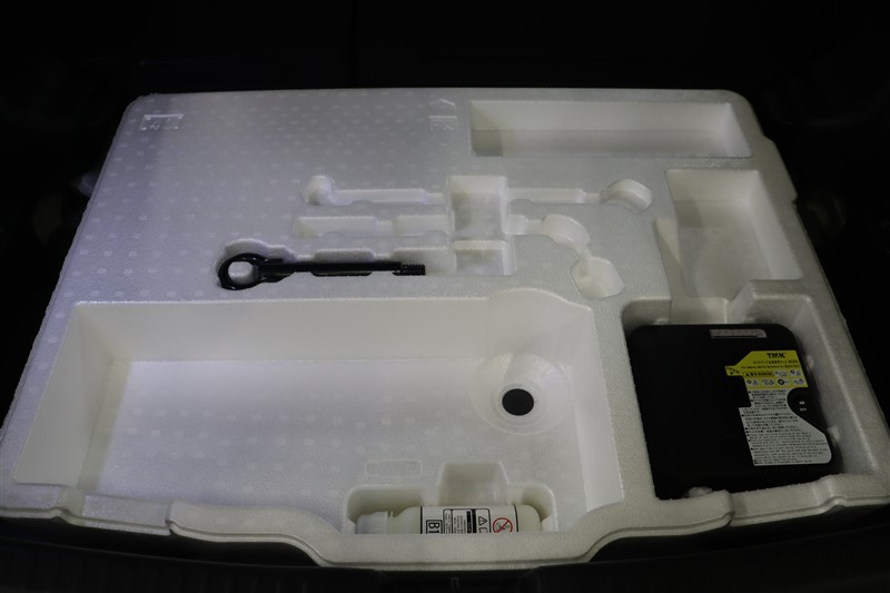ラゲージスペースには床下収納を備えています。洗車用品などをいれておけるので便利ですよ。手前に装備されているのはパンク修理キットです。最近は未使用のまま廃棄となるスペアタイヤが多いので、エコですね。