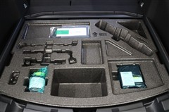 ラゲージスペースには洗車用品などの収納に便利な床下収納を備えています。スペース内にパンク修理キットを装備。非常時給電システムを作動させる場合に窓に装着する外部給電アタッチメントも装備しています。