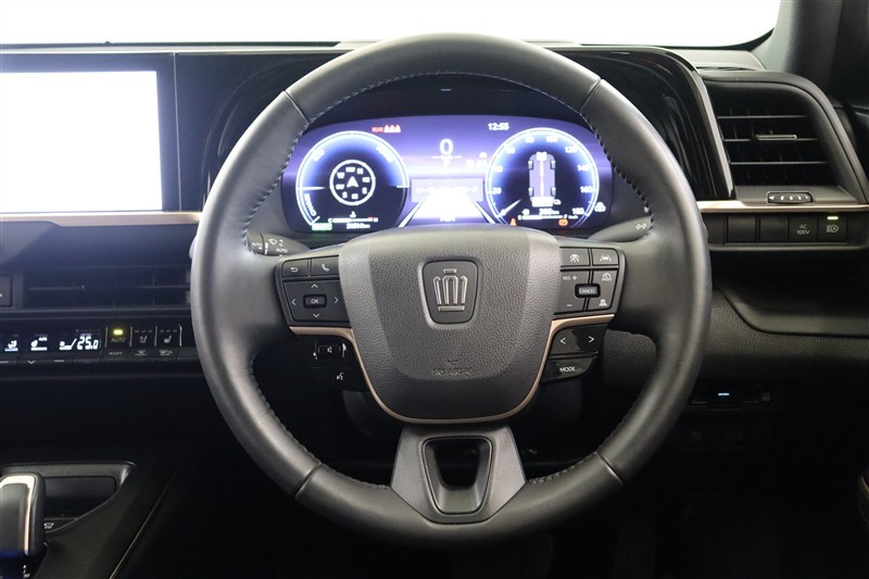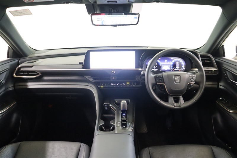 黒基調にカッパーのアクセントがお洒落な高級感を漂わせるステアリング廻りです。ディスプレイやメーター、操作機器が水平に集約され、迷うことなく直観的に運転できるデザインはさすがクラウンです。