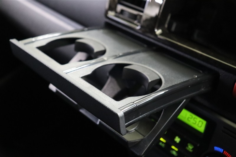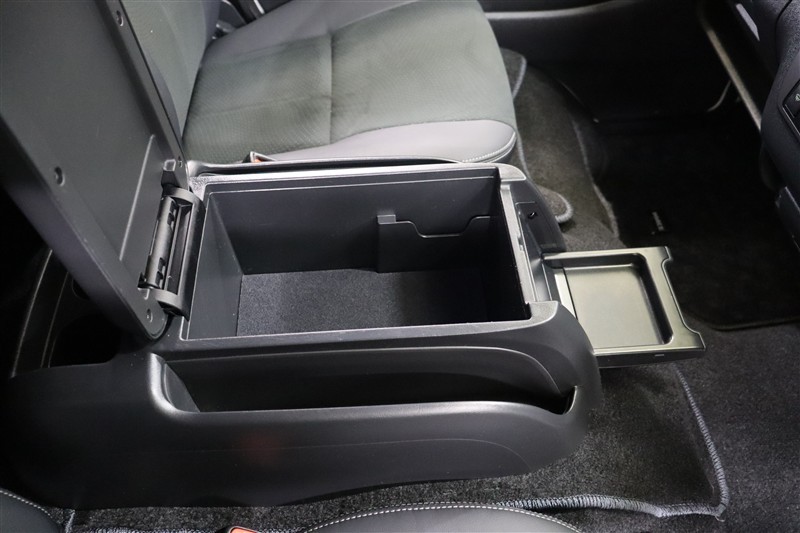 センターコンソールは収納ボックスになっています。引き出すトレイやサイドポケットも備え便利な収納です。後方には後席用のドリンクホルダーも装備しています。