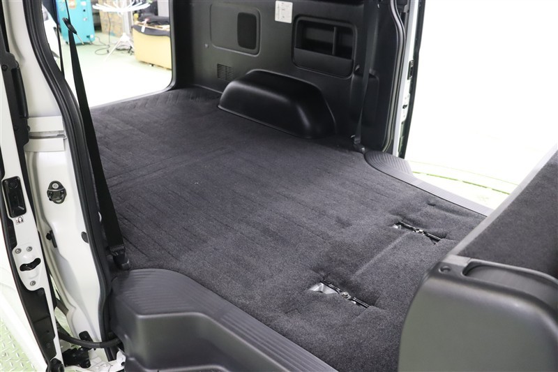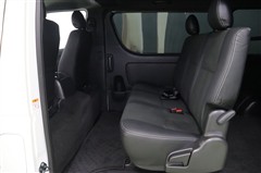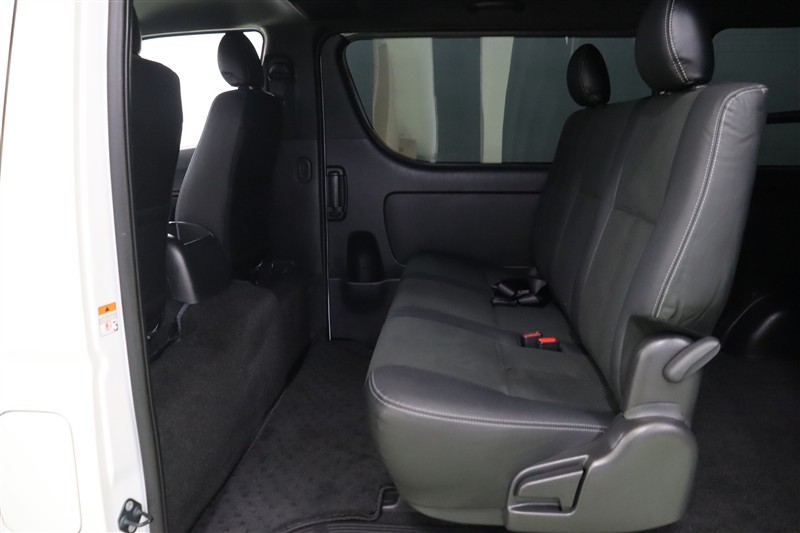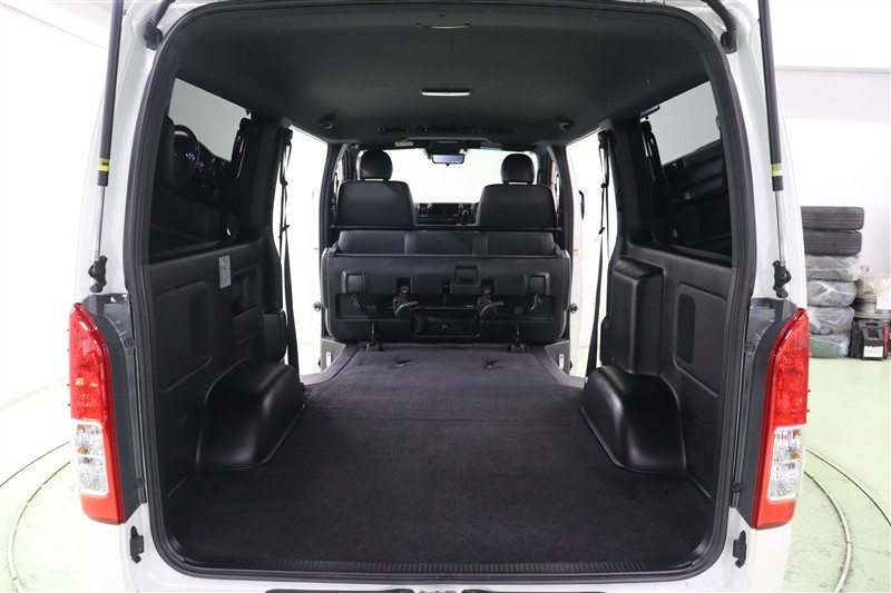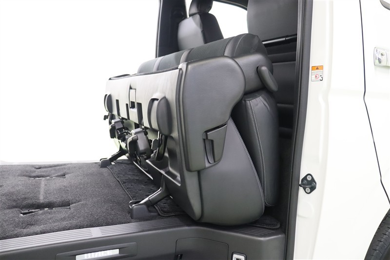 ラゲッジスペースを大きく使う場合は軽い力でこのようにフロント席の後ろにスッキリとたためます。乗車人数や荷物の多さに合わせてフレキシブルにアレンジできるのもハイエースバンの魅力です。