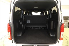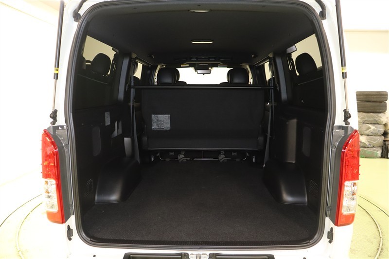 これがハイエースの魅力の大容量のラゲージスペースです。ロードバイクなら4台、サーブボードもまっすぐ積めるゆとり充分のロングスペースです。最大積載量1000Kgはとても魅力ですね。