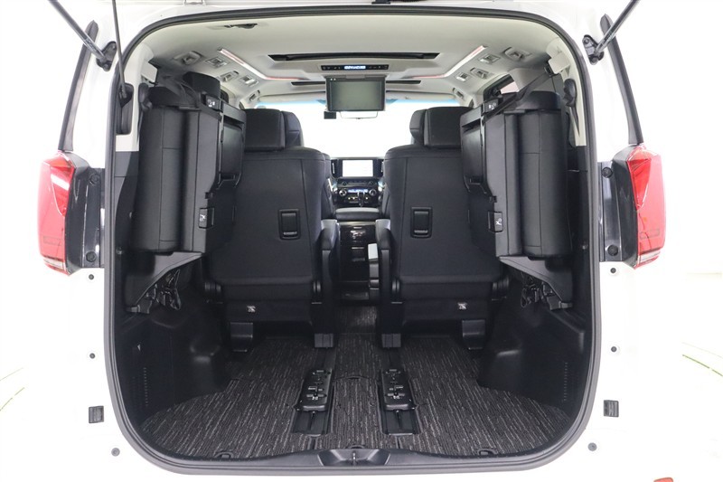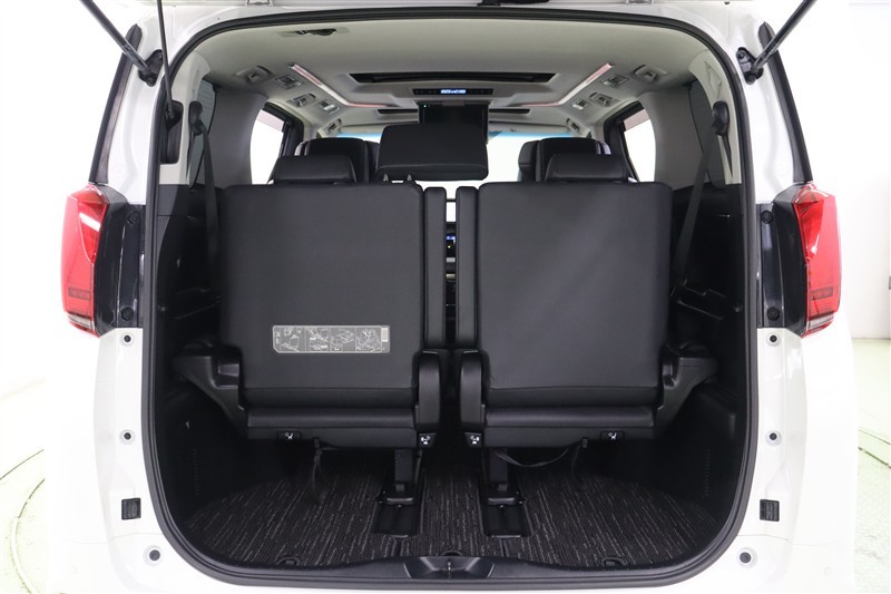 3列目を跳ね上げ収納したラゲージスペースです。シートが跳ね上がるのでフロアに干渉せずスッキリとしています。荷室フロアの地上高は低く、荷物の積み降ろしが楽ですよ。