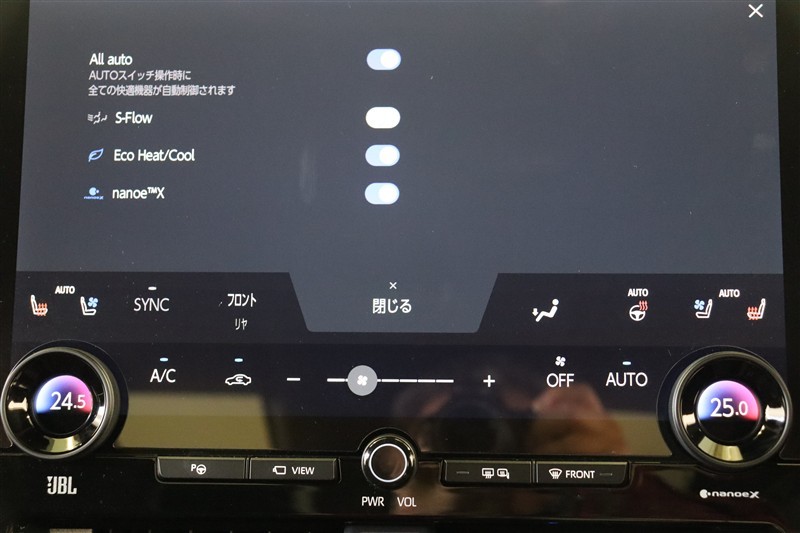 エアコンは運転席・助手席に加え、後席でも左右独立した設定が出来るフルオートエアコンです。抑制効果の発揮スピードが速いナノイーX搭載。肌や髪にやさしいナノイーが室内を爽やかな空気環境にしてくれます。