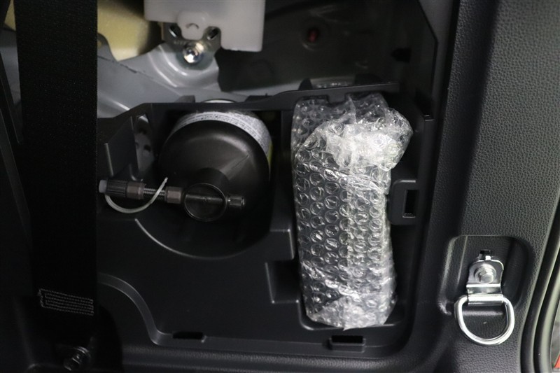 パンク修理キットを装備しています。最近は未使用のままで廃棄となるスペアタイヤが多いので、エコの観点からパンク修理キット付が増えています。軽量化によって燃費の向上にも一役かっているそうです。