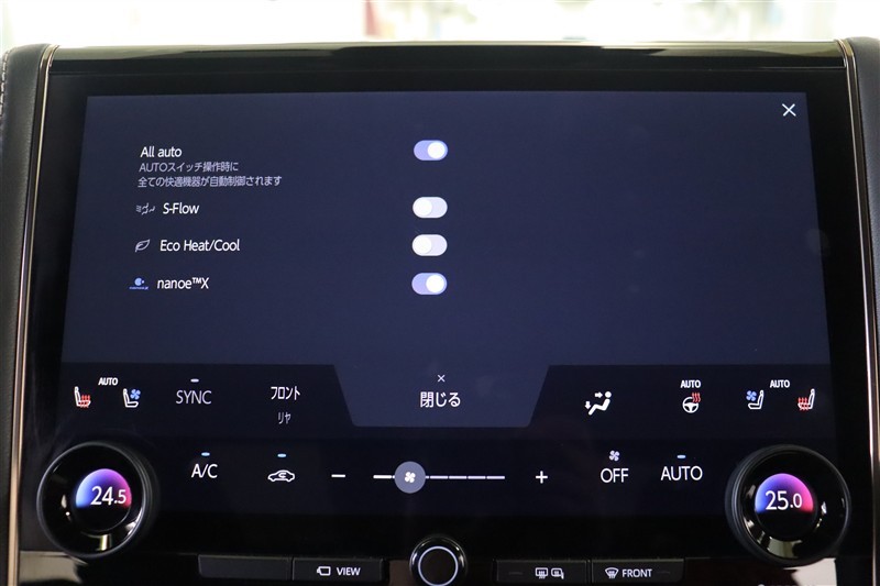 エアコンは運転席・助手席に加え、後席でも左右独立した設定が出来るフルオートエアコンです。抑制効果の発揮スピードが速いナノイーX搭載。肌や髪にやさしいナノイーが室内を爽やかな空気環境にしてくれます。