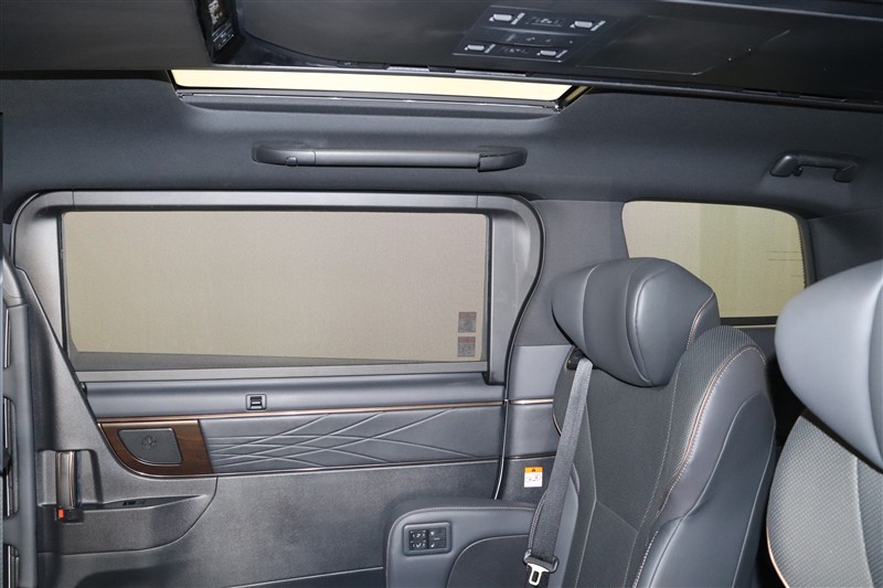 下降タイプのパワーサイドサンシェード(スライドドアガラス・リヤクォーターガラス)を装備しています。しっかり遮光できますし、電動でお好みの位置に止められます。プライバシー保護にも活躍してくれますよ。