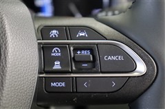 追従機能付クルーズコントロール搭載。アクセルを踏み続けなくてもセットした一定速度を維持。また、渋滞などで先行車が停止した場合停止し、先行車が再発進するとドライバー操作で発進した後に追従走行を再開します