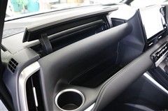 助手席側のオープントレイは深さがあり、収納しやすくなっています。しっかりしたドリンクホルダーも装備。少し小さめですがトレイ上にはアッパーボックスも備えています。リッド付きなので埃もたまりにくいですよ。
