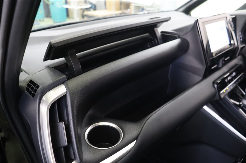 助手席側のオープントレイは深さがあり使いやすいですよ。置きやすく取り出しやすいのがオープントレイの良いところですね。上部にはリッド付きの収納スペースも備えています。