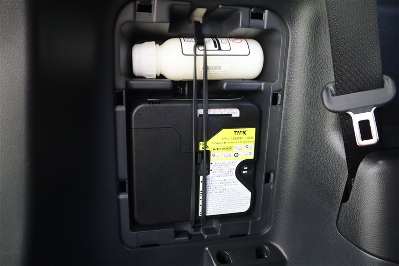 パンク修理キットを装備しています。最近は未使用のままで廃棄となるスペアタイヤが多いので、エコの観点からパンク修理キット付が増えています。軽量化によって燃費の向上にも一役かっているそうです。