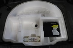 ラゲージスペースには床下収納を備えています。洗車用品などを入れておけて便利ですよ。スペース内にパンク修理キットを装備しています。最近は未使用のまま廃棄となるスペアタイヤが多いので、エコですね。
