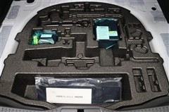ラゲージスペースには床下収納を備えています。洗車グッズなどをいれておけるので便利ですよ。奥に装備されているのはパンク修理キットです。最近は未使用のまま廃棄となるスペアタイヤが多いので、エコですね。