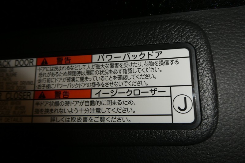 バックドアの底部にパワーバックドアとイージークローザーの取り扱いに関する説明と注意を記入したステッカーが貼ってあります。
