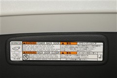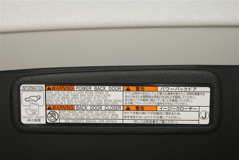 バックドアの底部にパワーバックドアとイージークローザーの取り扱いに関する説明と注意を記入したステッカーが貼ってあります。