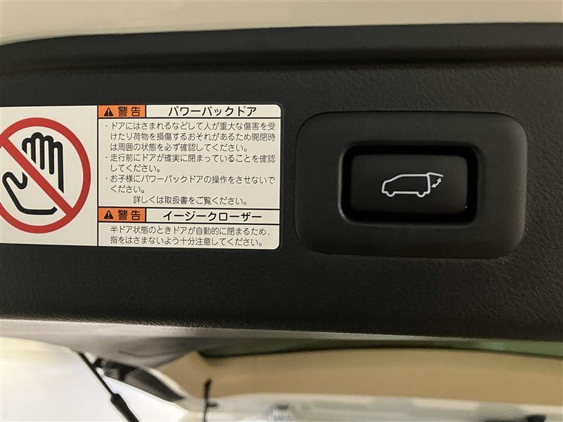 バックドアの底部にパワーバックドアとイージークローザーの取り扱いに関する説明と注意を記入したシールが貼ってあります。シールの横にパワーバックドアのスイッチが付いてます