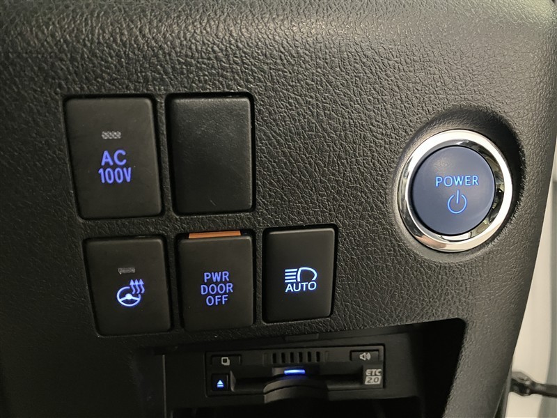 エンジン始動/停止ボタン・AC100Vスイッチ・ステアリングヒータースイッチ・パワースライドドアOFFスイッチ・アダプティブハイビームスイッチです。