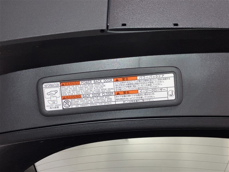 バックドアの底部にパワーバックドアとイージークローザーの取り扱いに関する説明と注意書きしたシールが貼ってありシールの横にパワーバックドアスイッチとパワーバックドアクローズ&ロックボタンが付いてます。