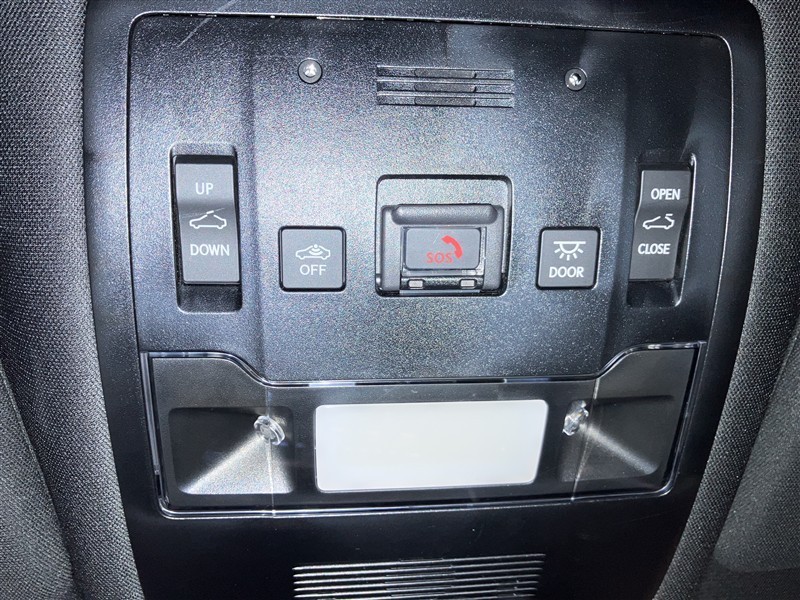 天井にムーンルーフのチルトアップダウンスイッチ/開閉スイッチ・侵入センサーOFFスイッチ・インテリアランプドア連動スイッチ・ヘルプネットスイッチパネルが付いています。
