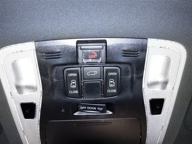 天井に両側パワースライドドア開閉スイッチ・室内灯メインスイッチ・マップランプスイッチ・パワーバックドア開閉スイッチ・ヘルプネットボタンが付いています。