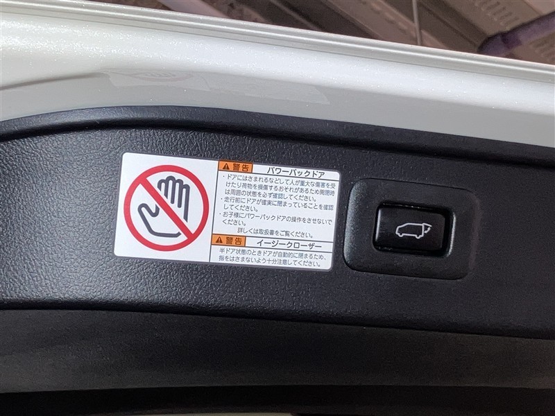 バックドアの底部にパワーバックドアとイージークローザーの取り扱いに関する説明と注意を記入したシールが貼ってあります。シールの横にパワーバックドアのスイッチが付いてます