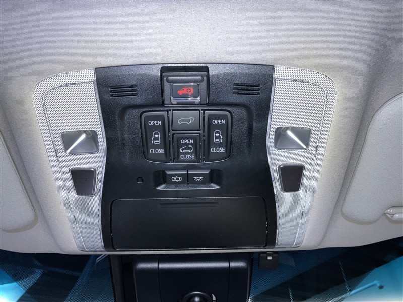 天井にリヤムーンルーフスイッチ・室内灯メインスイッチ・マップランプスイッチ・パワースライドドア開閉スイッチ・リヤバックドア開閉スイッチ・ヘルプネットボタンが付いています。