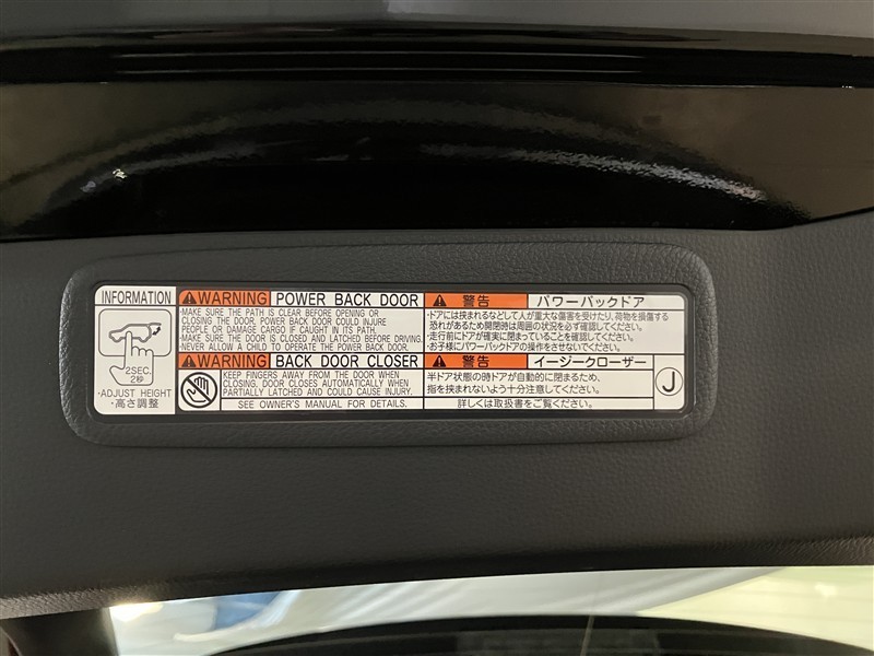 バックドアの底部にパワーバックドアとイージークローザーの取り扱いに関する説明と注意を記入したステッカーが貼ってあります。