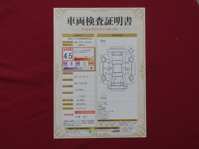 日本自動車査定協会の監査確認証付きです。ご安心してご検討下さい。